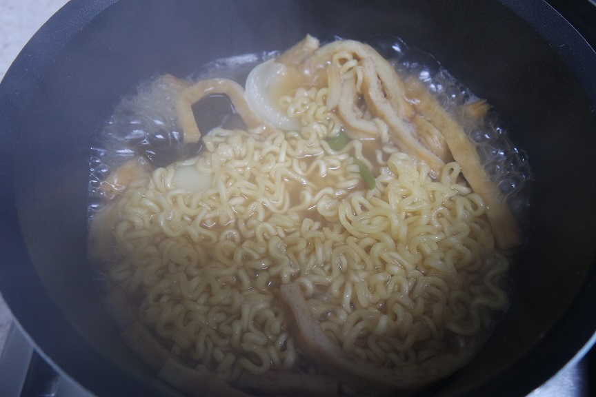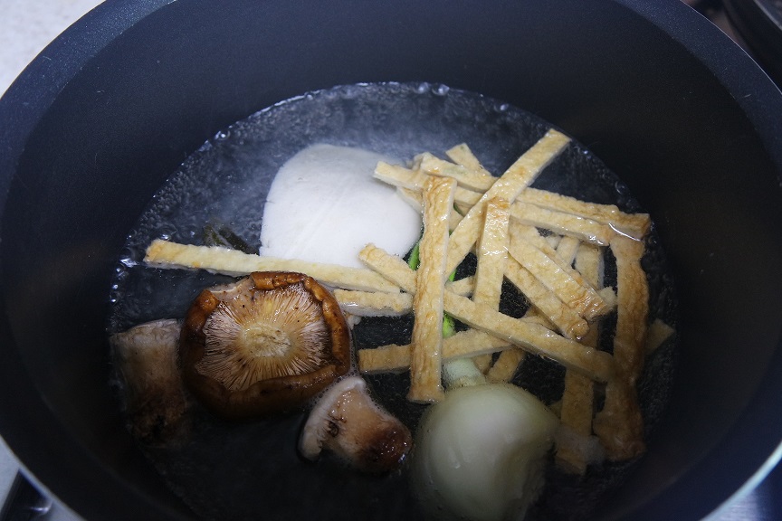 무, 표고기둥, 다시마는 건져버리고 쯔유와 간장을 2큰술씩 넣고 사리면을 한 개 넣어 익혀줍니다.
